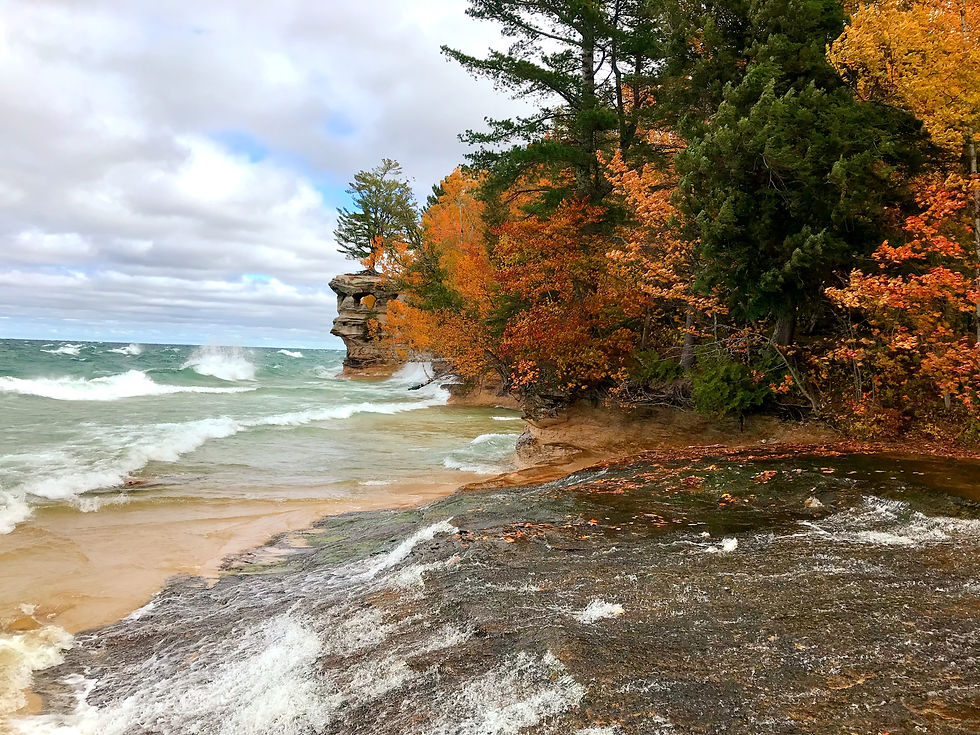 We have taken many trips to Pictured Rocks National Lakeshore. No matter the season, it never disappoints. Our trip in October 2020 was one unlike any other that we had experienced. It was a brisk fall day. We arrived at the trailhead to find a ton of people already there. We had gotten a little bit of a late start. We had to park approximately 3/4 mile from the trailhead. This is not ideal considering it is already a 10+ mile hike we planned on doing. We quickly made our way to the trailhead as people poured in. We hike fast, so we passed a lot of people on our way. We figure the faster we get around the crowds, the sooner we can have some time by ourselves with nature. After about a mile or so into the trail, you come across the beautiful Chapel Falls. It really does have to be seen to believe. We took in the sight from the top of the waterfall, but it is only after you pass over a small bridge and get to the overlook that you truly understand its size and complexity. We took a short break here to take a few photographs and just take in the view. Just as amazing as we remembered. The only difference this time was that the fall colors were on full display.
